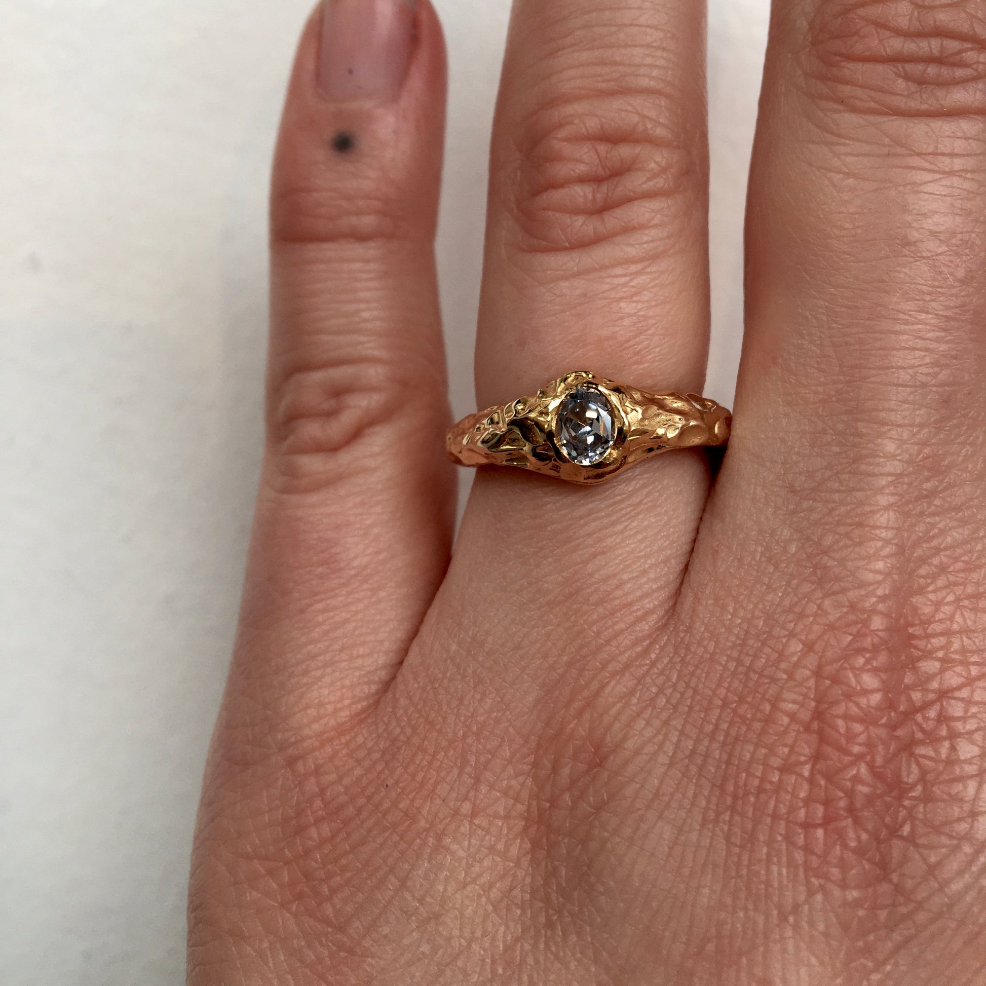 This exclusive 14ct gold ring is the perfect jewelry piece for expressing your individuality. Its organic structure and one-of-a-kind light blue sapphire make it truly unique. Show off your personal style with this piece of art.