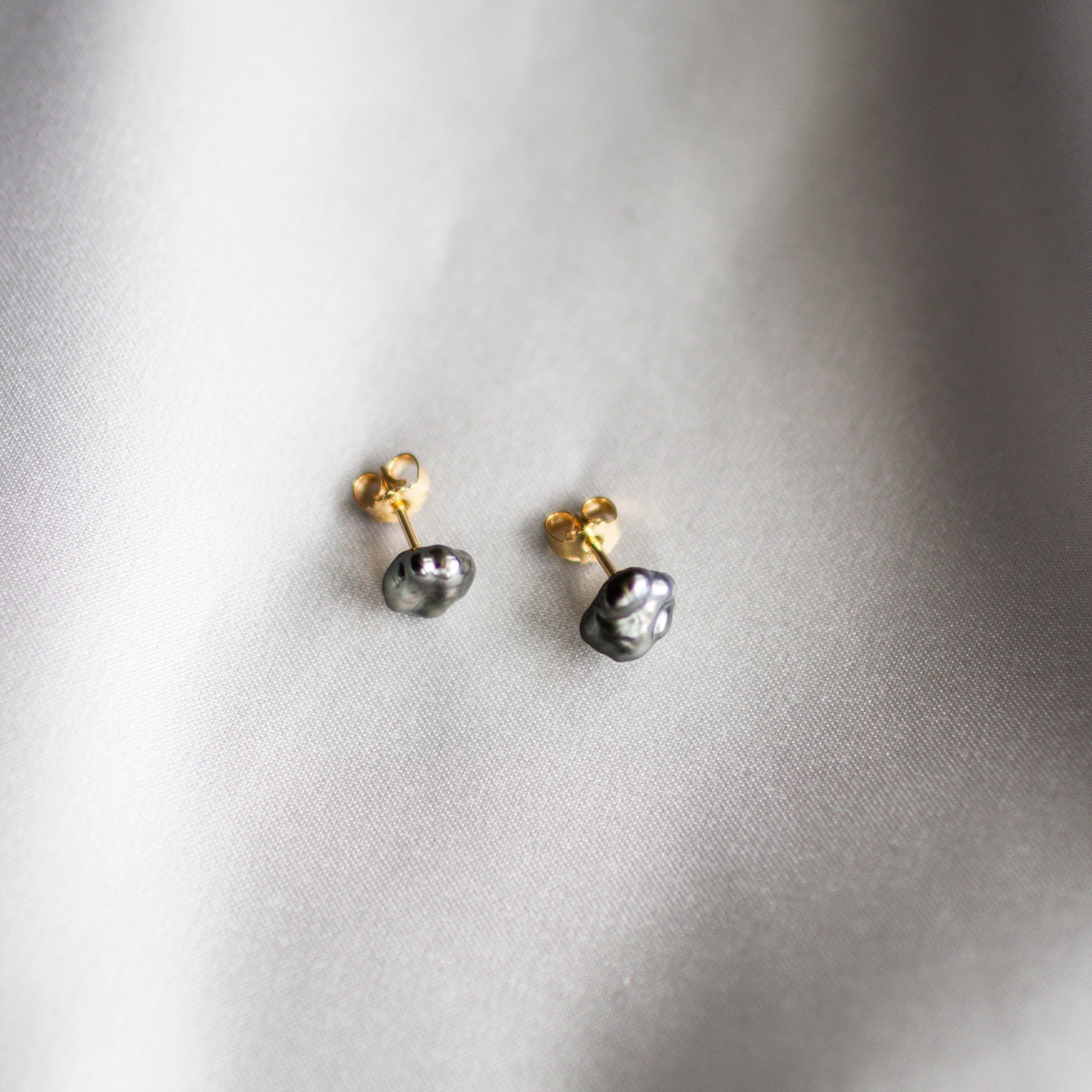 Unique Tahiti Keshi pearls made into a pair of simple 14k gold earpieces.