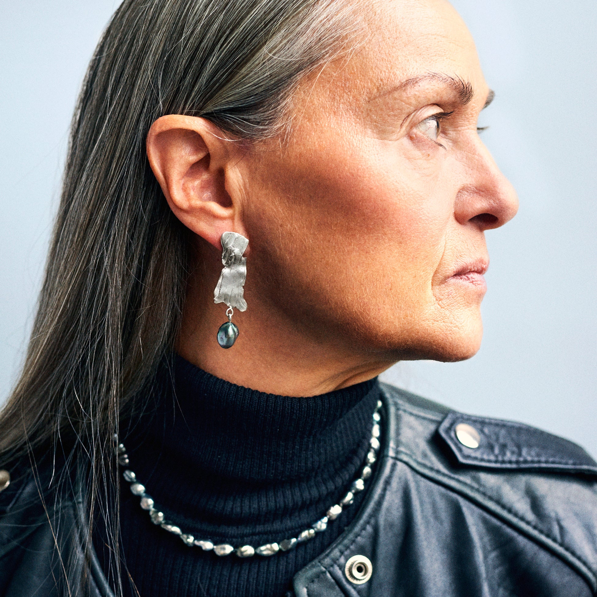 One-of-a-kind Earpieces - every handsculptured silverpiece and pearl is unique. Statement earpieces with a soft, organic and sculptural feel. Attached at the end is a beautiful Sustainable Tahiti Keshi Pearl.