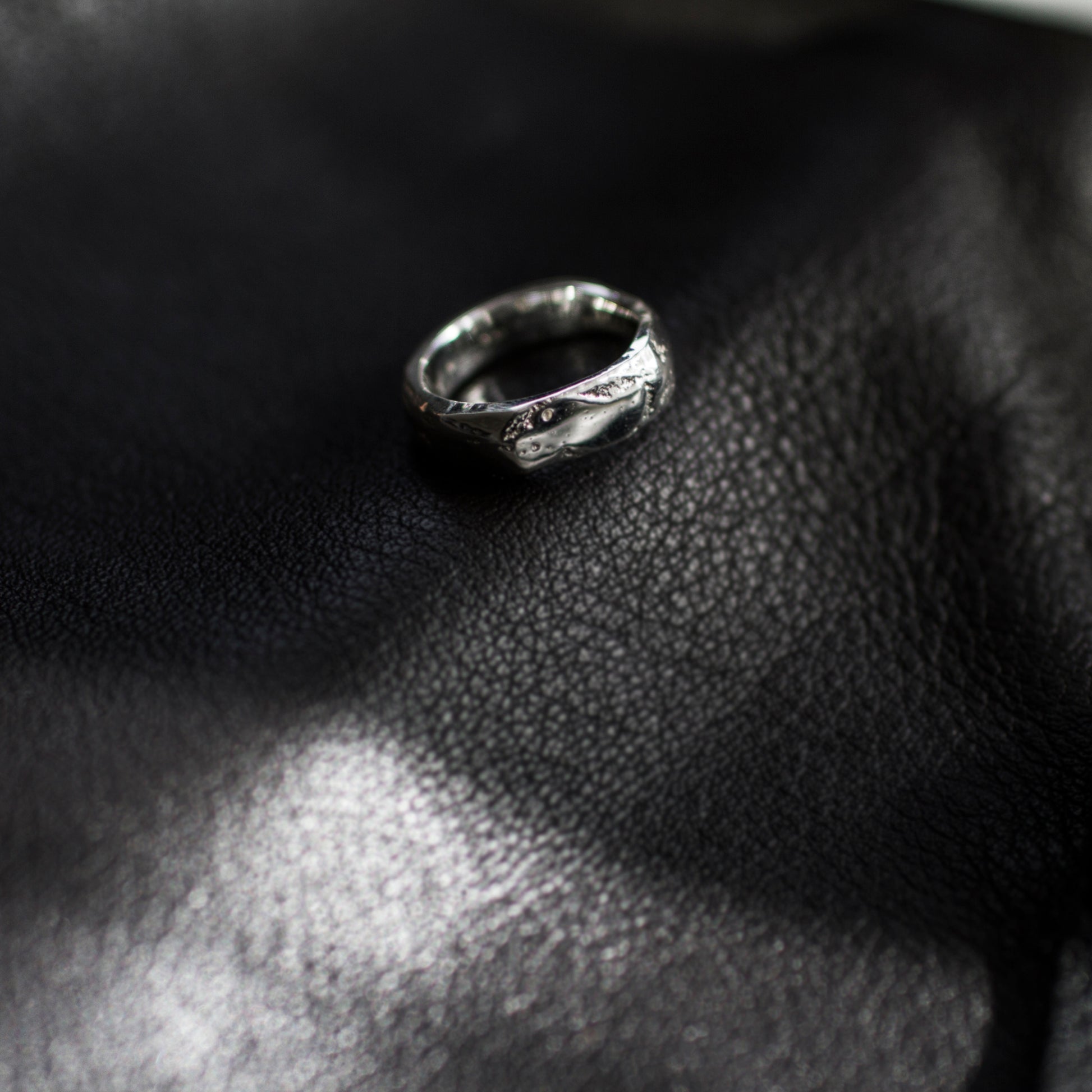 Solid moulded thin signet ring with a rough surface. The surface may differ from ring to ring, therefore every piece is unique. Fits both woman and men.