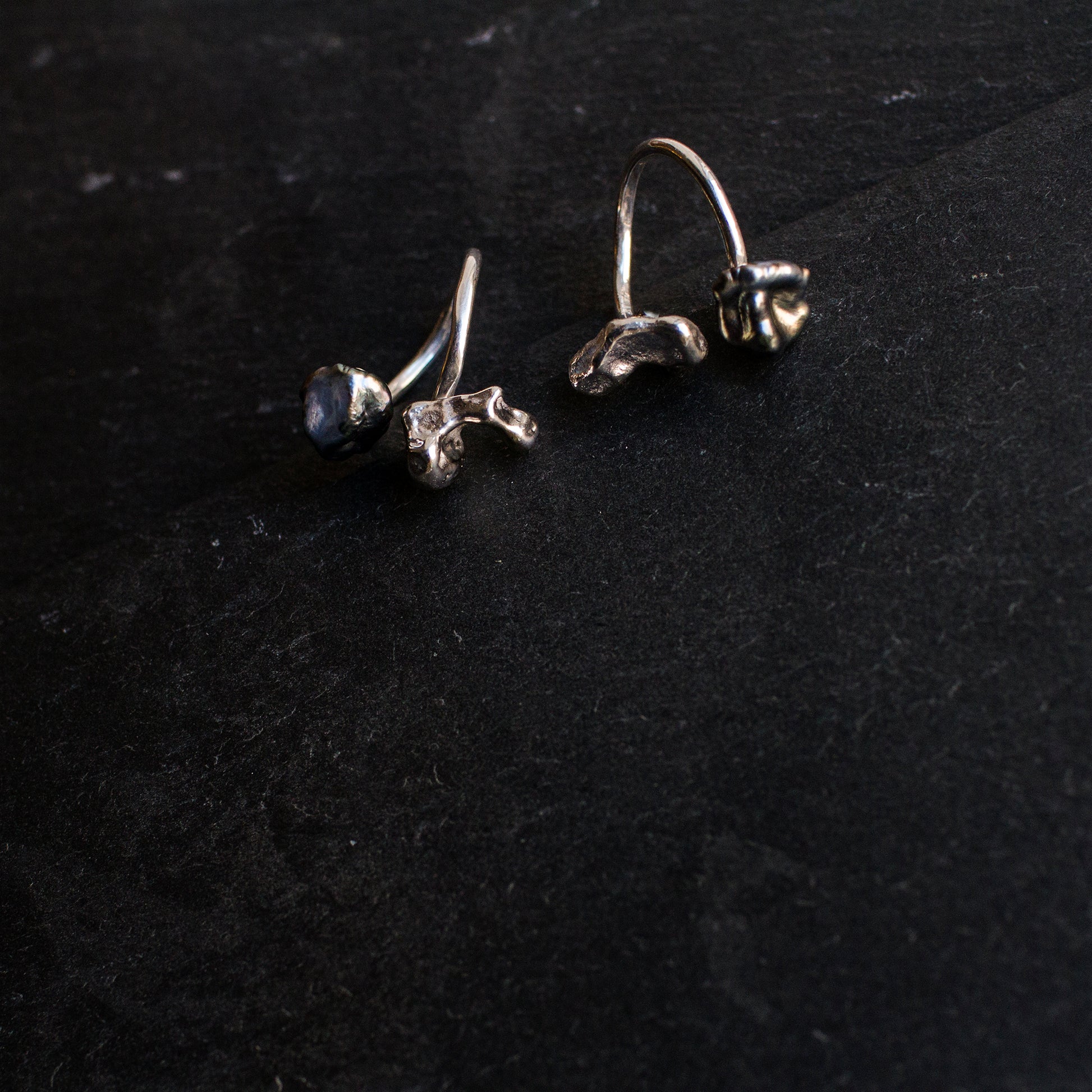 Statement ring with a beautiful sustainable Tahiti Keshi Pearl. The pearl is attached to a silver ring with an Organic Meltdown piece. This ring is one-of-a-kind.