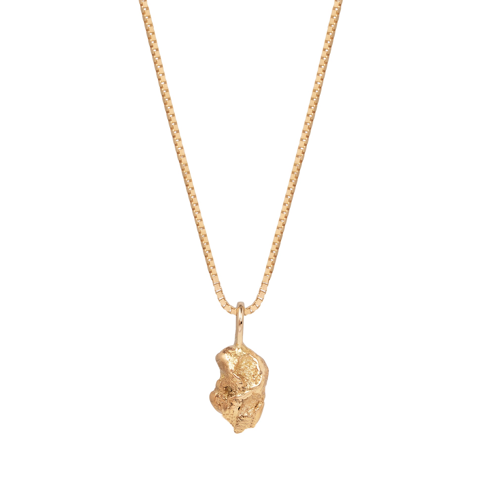 Raw and simple pendant attached to a delicate 8k gold venezia chain. The pendant is made out of pure 14k gold letovers from the rest of the jewellery collections. The process allows the piece to come out different every time. Therefore you get an unique piece of jewellery made with extra care.